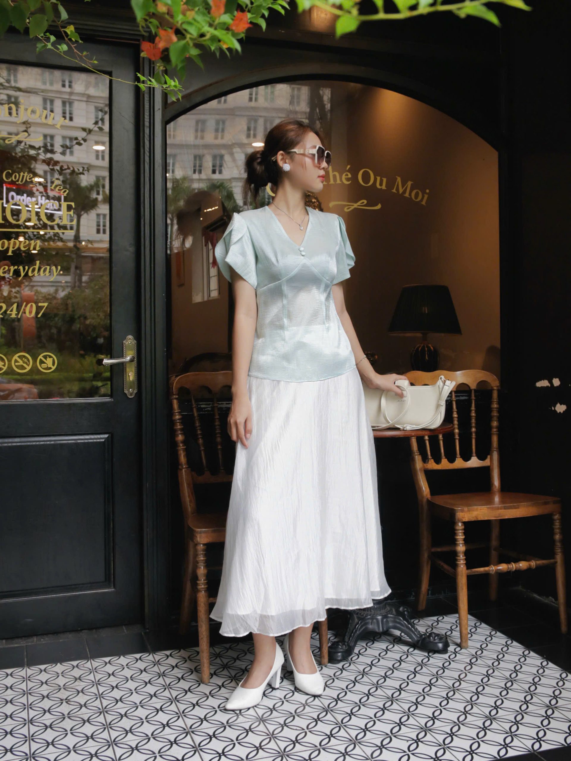 Thiết kế áo kiểu tơ ánh mềm mại, nhẹ nhàng tạo cảm giác bay bổng và đầy nữ tính. Chất vải tơ ánh cao cấp giúp tổng thể trang phục trở nên sang trọng, tinh tế và nổi bật trong mọi ánh nhìn.