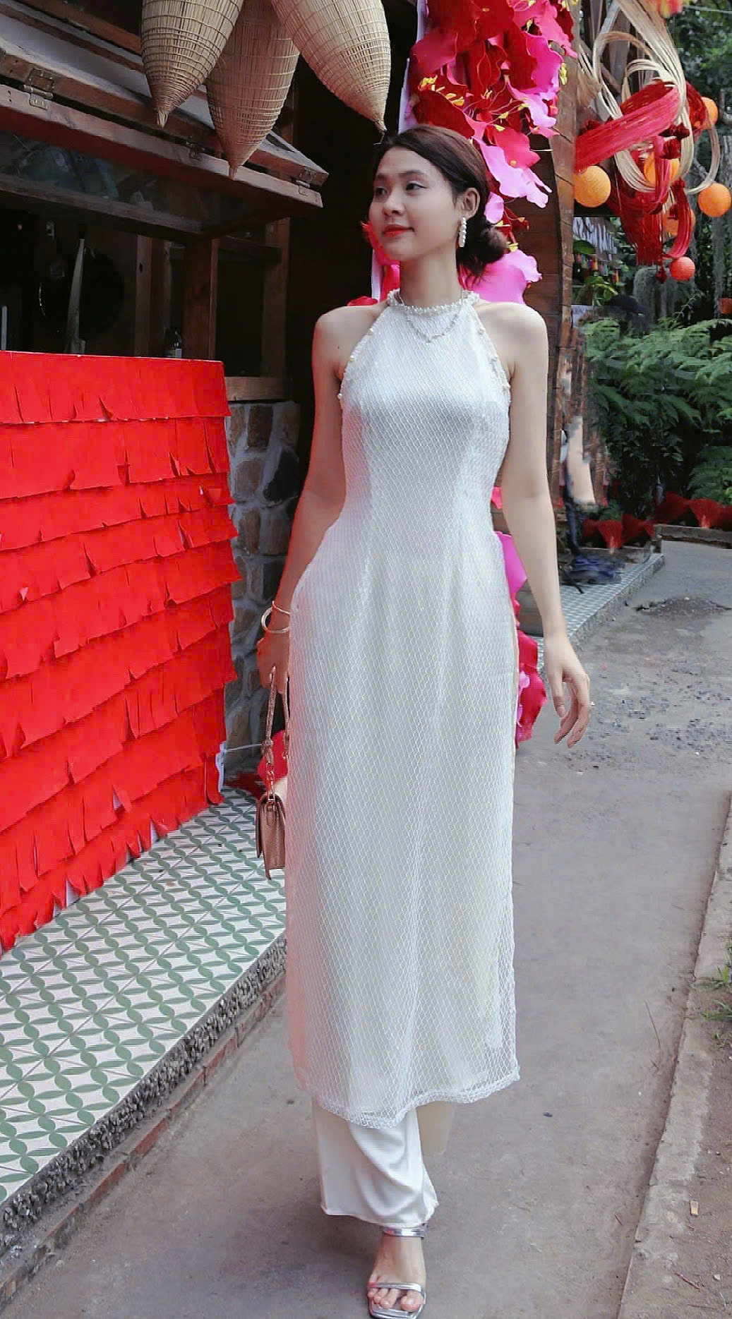 Set áo dài cổ yếm ren là sự kết hợp hài hòa giữa vẻ đẹp truyền thống và hơi thở hiện đại, mang đến diện mạo mềm mại, nữ tính nhưng vẫn giữ được nét trang nhã vốn có của áo dài Việt. Thiết kế cổ yếm tạo điểm nhấn tinh tế, giúp phần cổ và vai trông thanh thoát hơn, đồng thời tôn lên đường nét nhẹ nhàng của người mặc mà không quá phô trương.